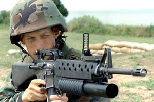 Americký voják , drží v rukou automatickou pušku M16A2 s granátometem M203